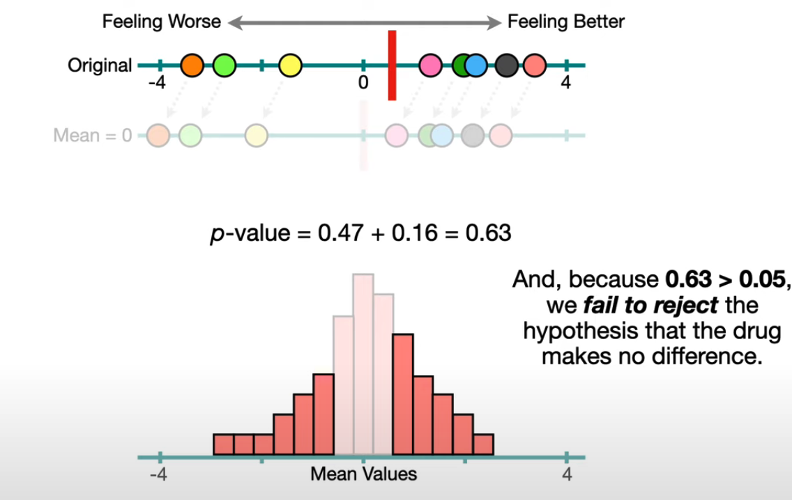 Therefore, p > 0.05, we fail to reject the null hypothesis that the drug has no effect, aka the drug does have some effect