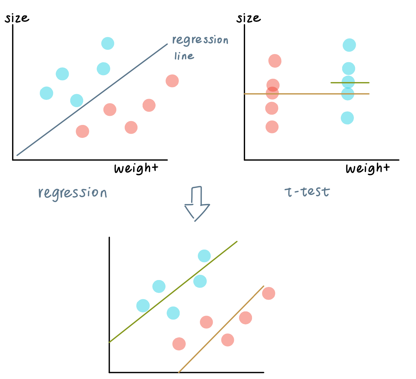 The limit of t-test: it only compares two groups but lose the connection between x and y
