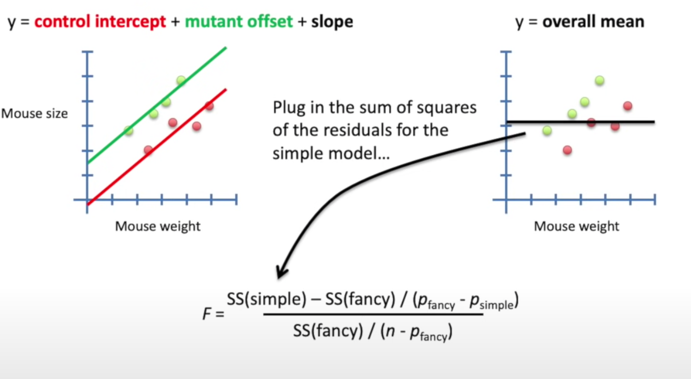 Based on the F-value, it can be converted to P-value, which is 0.003 in this case, less than 0.05, meaning the fancy model is significantly better than the simple model, or: taking weight and mouse type into consideration is significantly better at predicting size than just using the average size.
