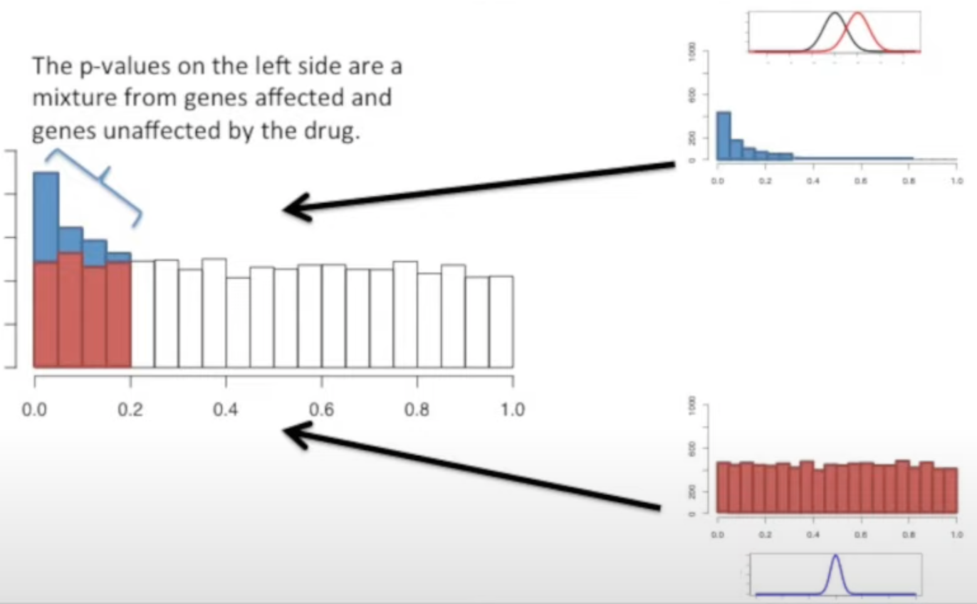 Eyeball method: We draw a line at the top of the evenly distributed p-values, and extend the line to separate the false positives from true positives.