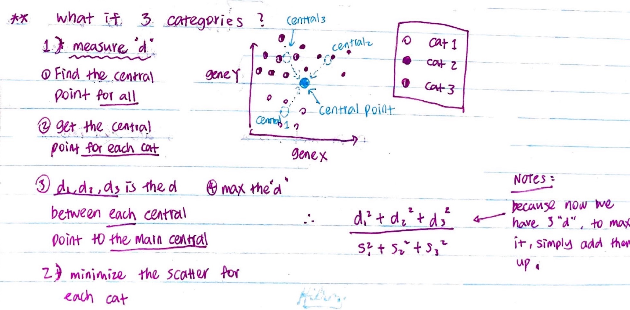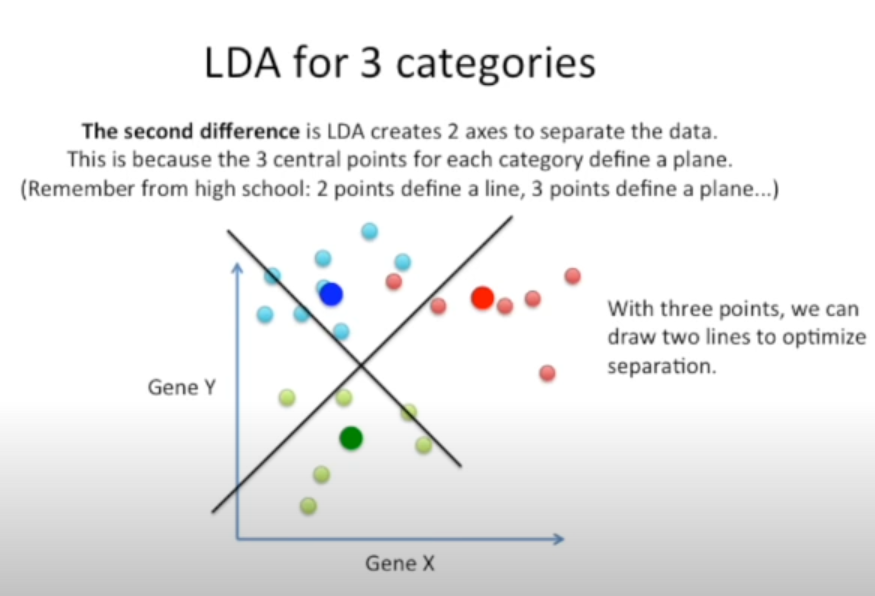 Say we have 3 categories and 10,000 genes. If we plot the raw data without reducing dimensions, it would require 10,000 axes. However, LDA can reduce the axes to only 2.