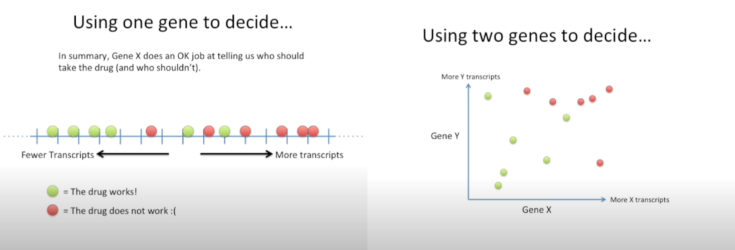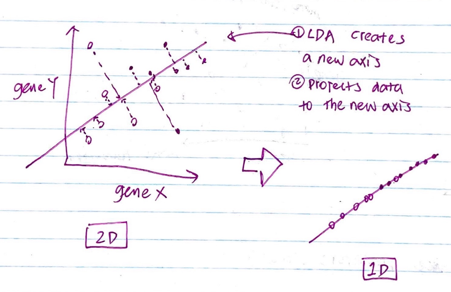 We can’t just simply dropping one of the axis (e.g. gene y) because it will lose data. Instead, LDA creates a new axis and project new data there. LDA creates the new axis based on two criterias: