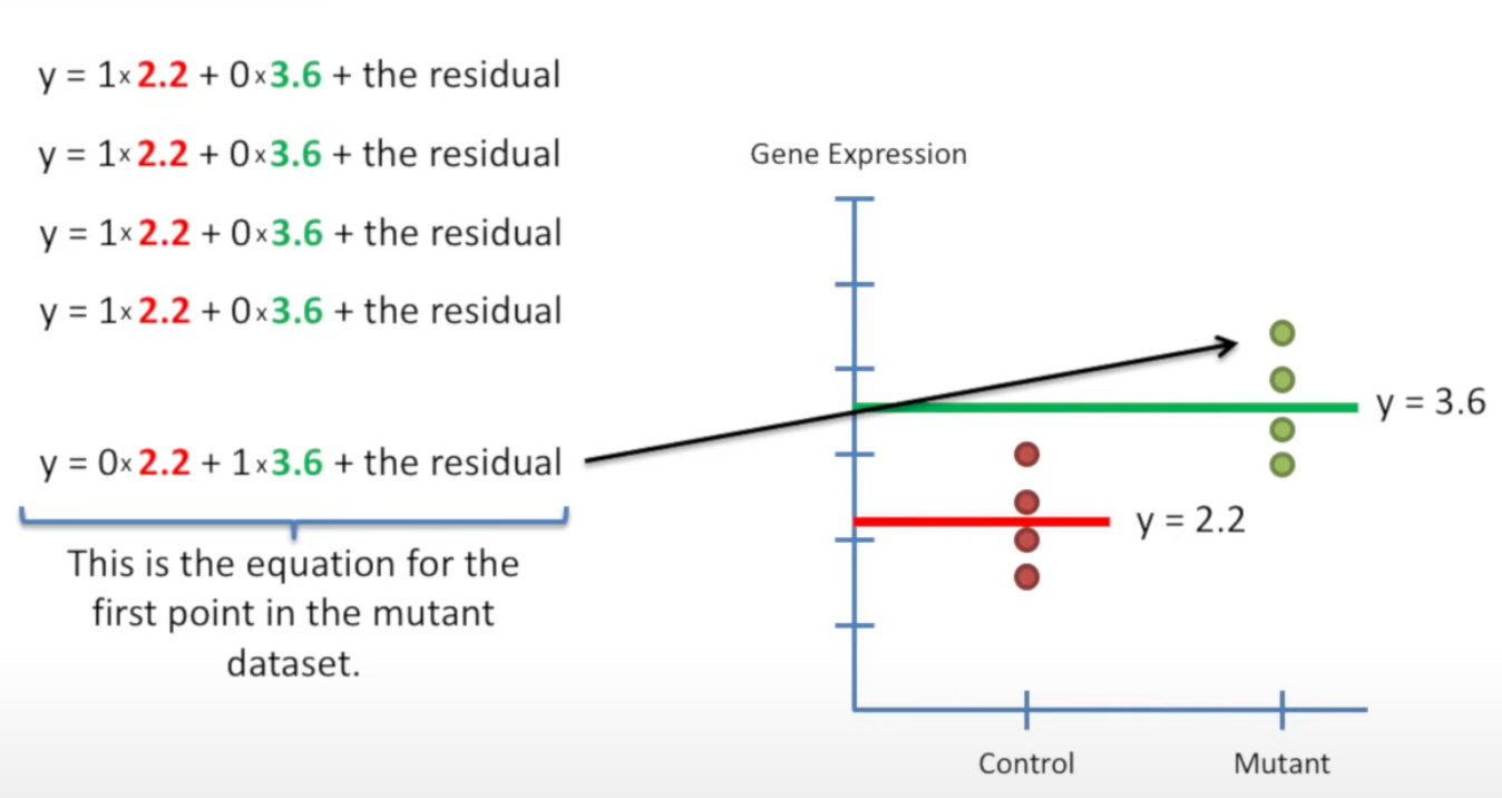 For t-test, if we also use least squares, the line would be the two mean lines of each group. Then we can combine the two lines into a single equation by computer.
